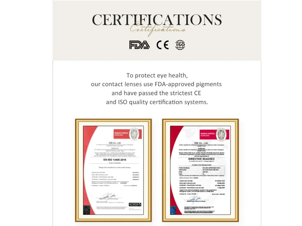 Feitas com PHEMA, um hidrogel suave e biocompatível, as nossas lentes são sinónimo de saúde e bem-estar para os seus olhos. A sua segurança é a nossa prioridade, e por isso as nossas lentes cumprem os mais rigorosos padrões de qualidade e segurança a nível internacional, possuindo certificação FDA/CE.